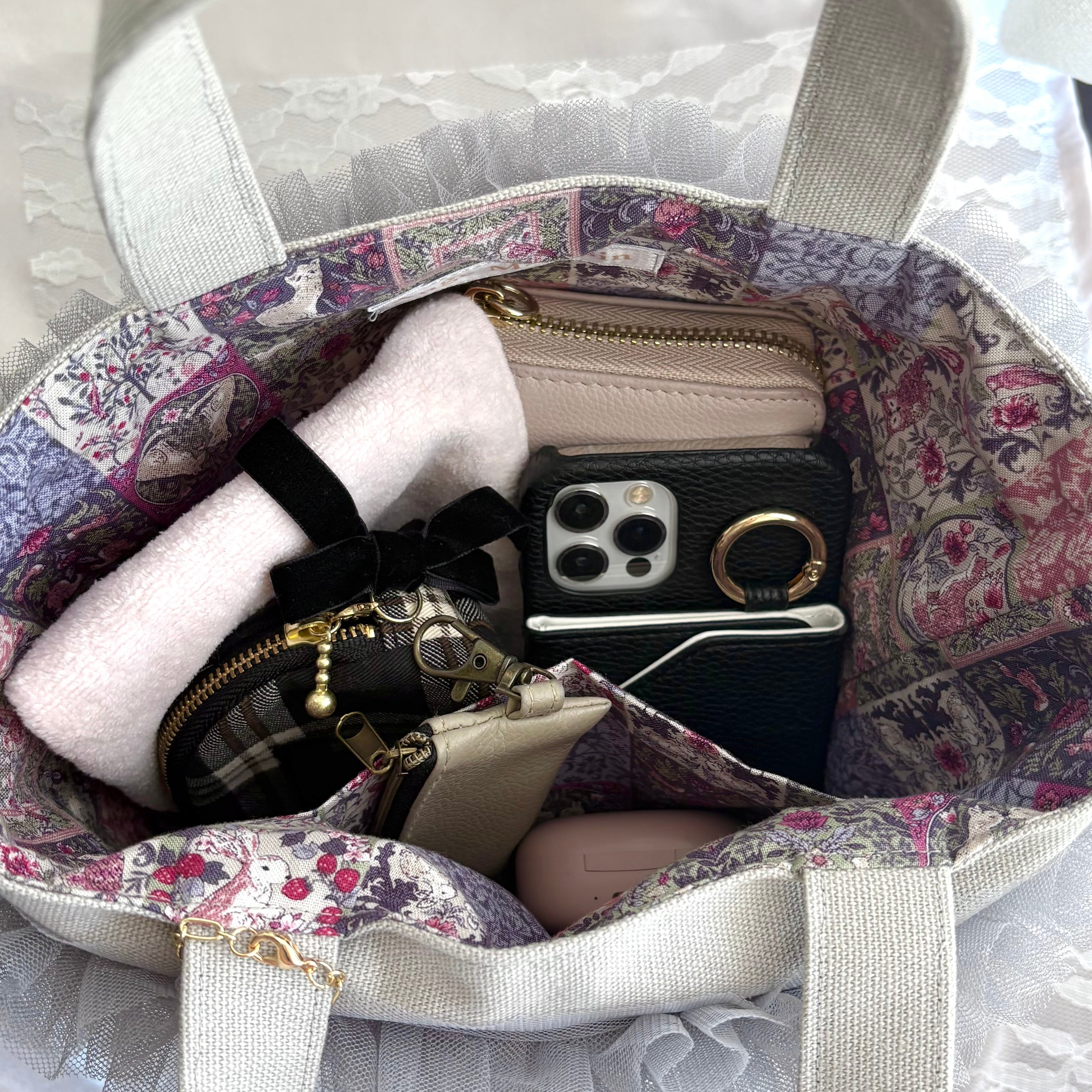 お弁当入れ サブバッグ 洗練されたチュールハンドバッグ グレー バッグチャーム付き フリル 内ポケット お出かけ 袋 ミニトート