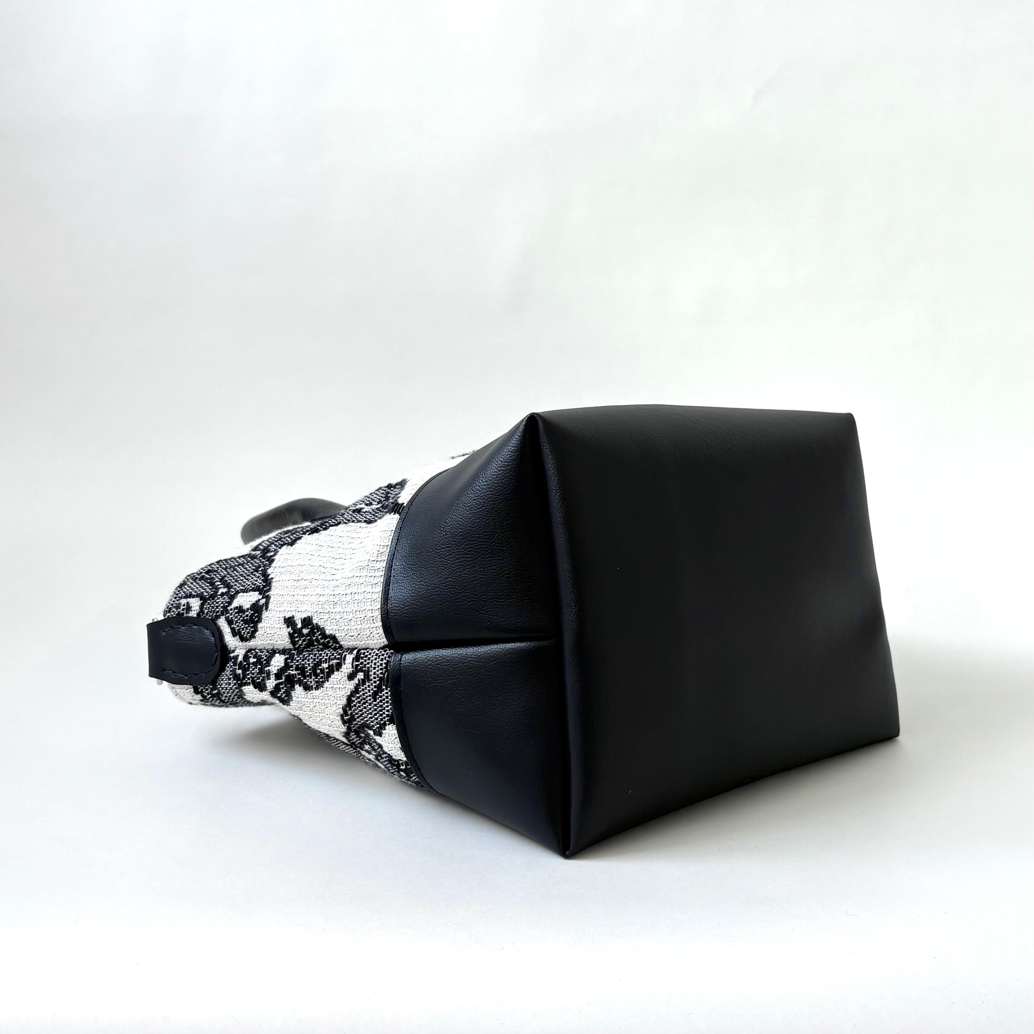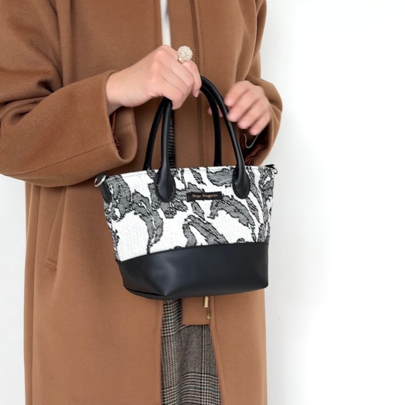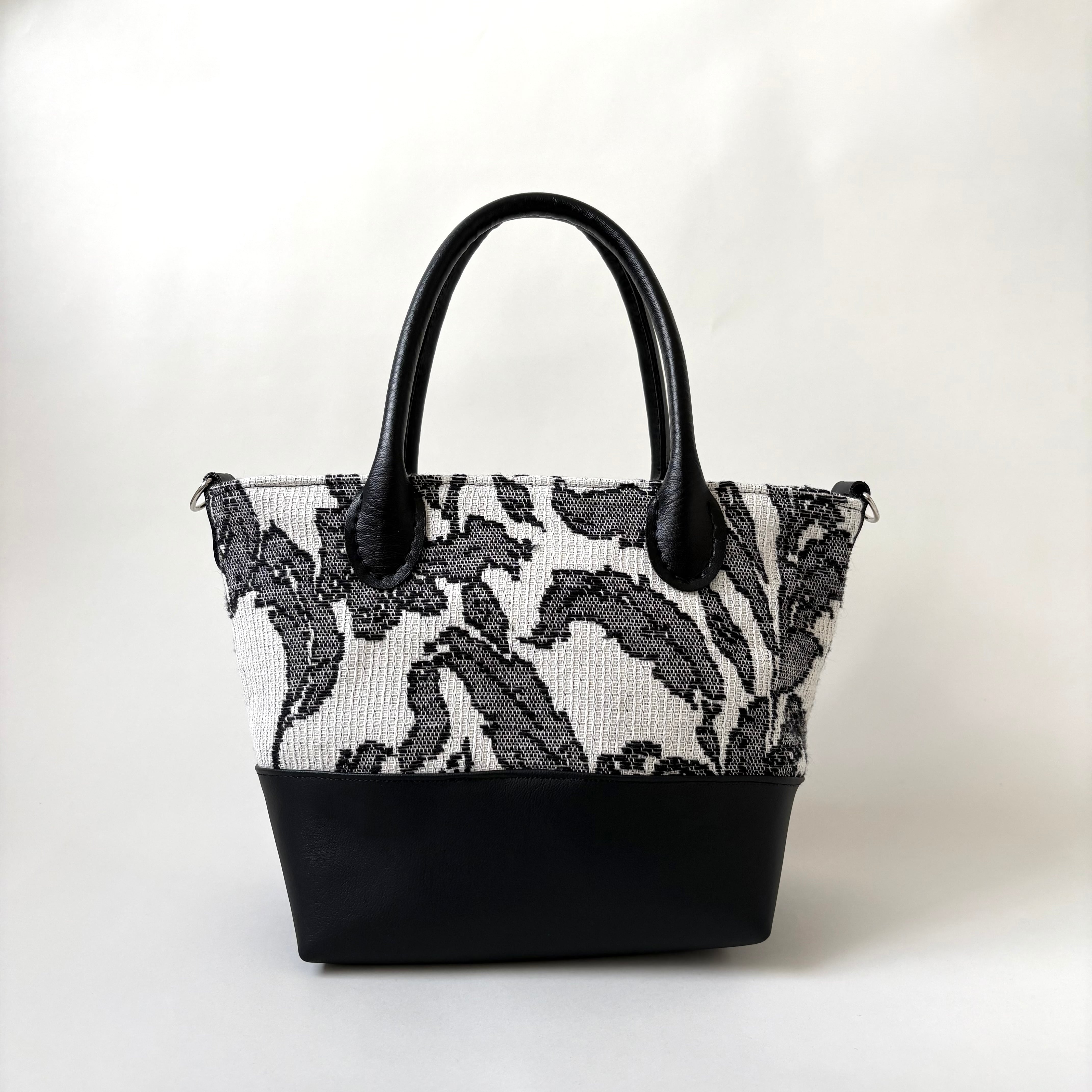 イタリア産ジャガード生地 レザートートバッグ 皮 革 2way ミニ 小ぶり ブラック 黒 持ち手 ショルダー 肩掛け 通勤 お仕事