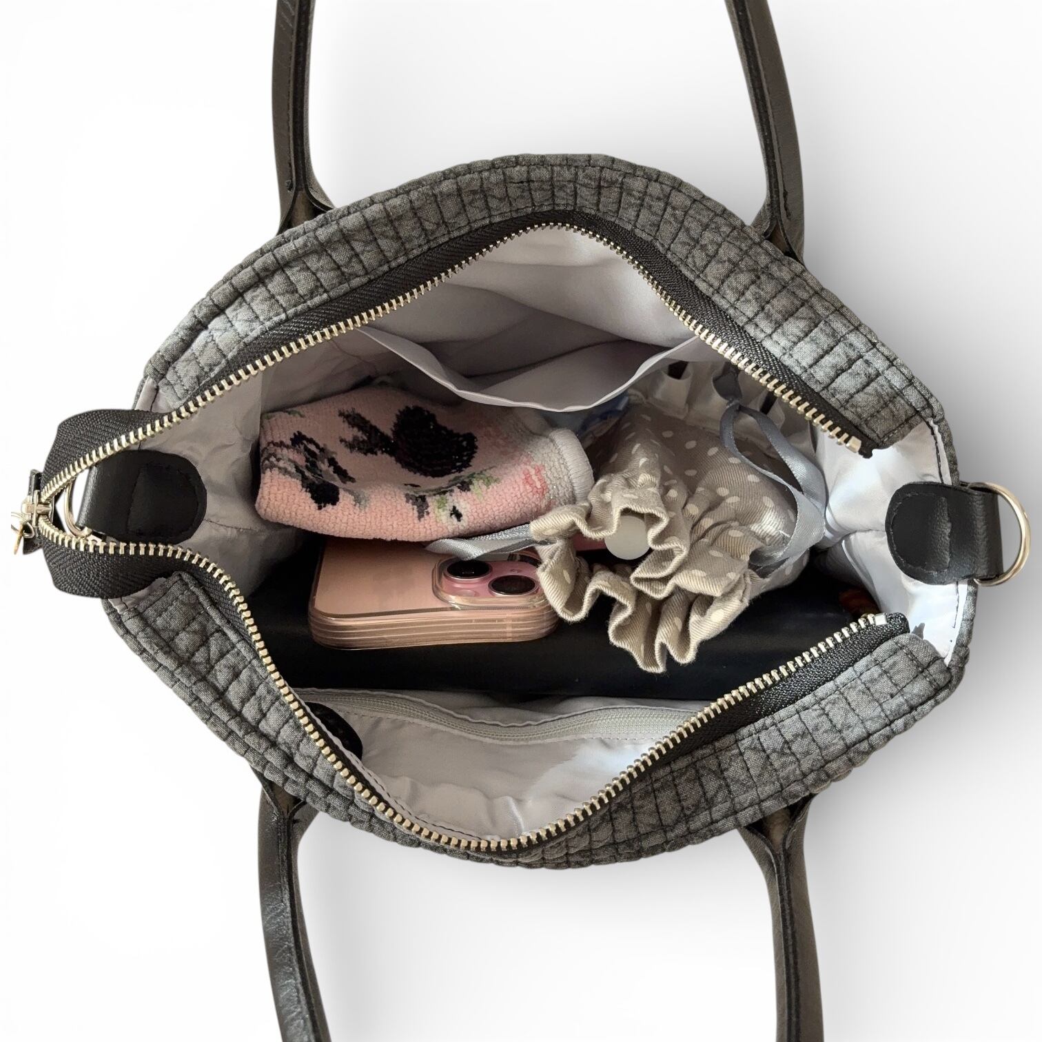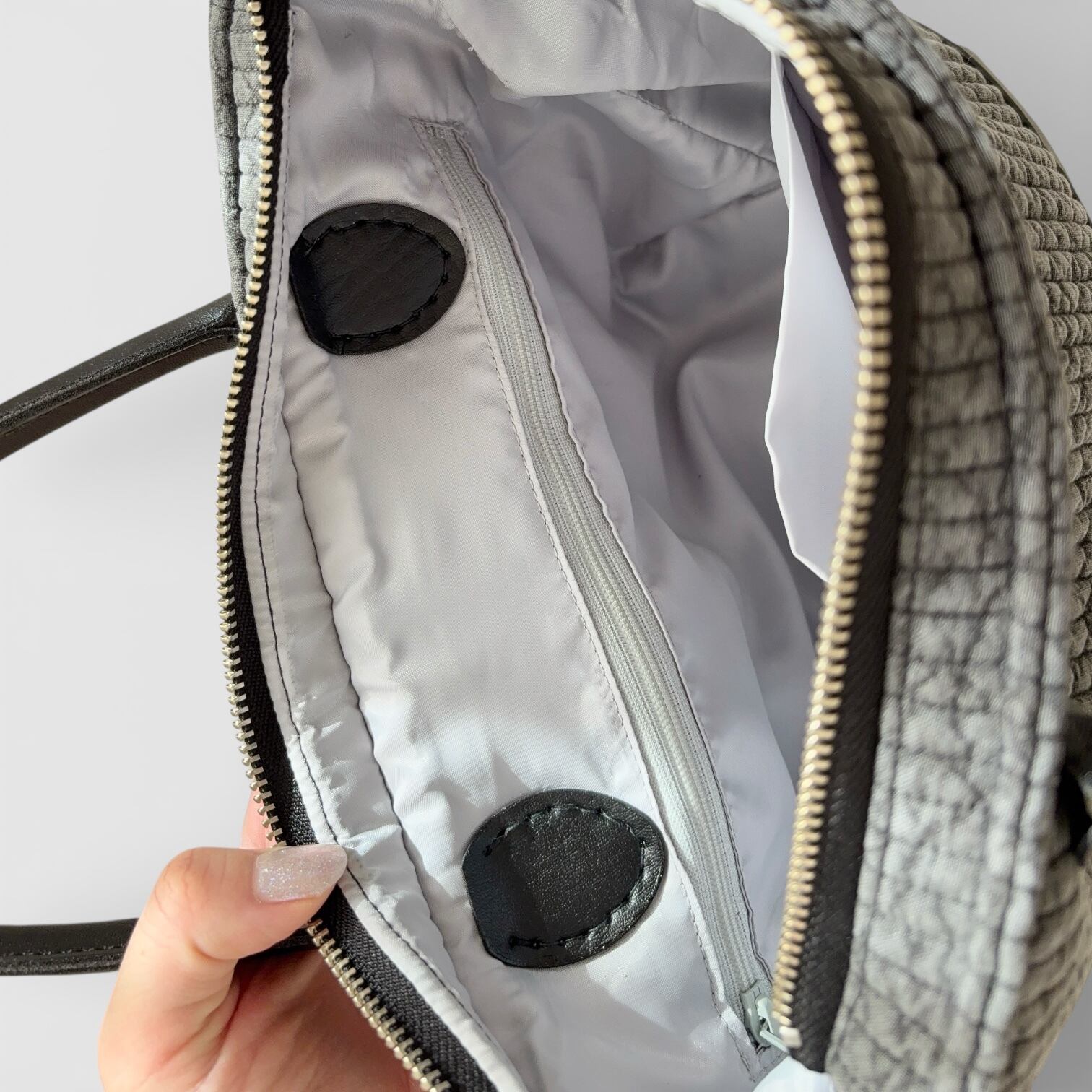 裏地は光沢感のブルーグレー使用。チャック付きポケットとすぐに取り出せるオープンなポケットの2つ装備。小物の整理もすんなり行えます。