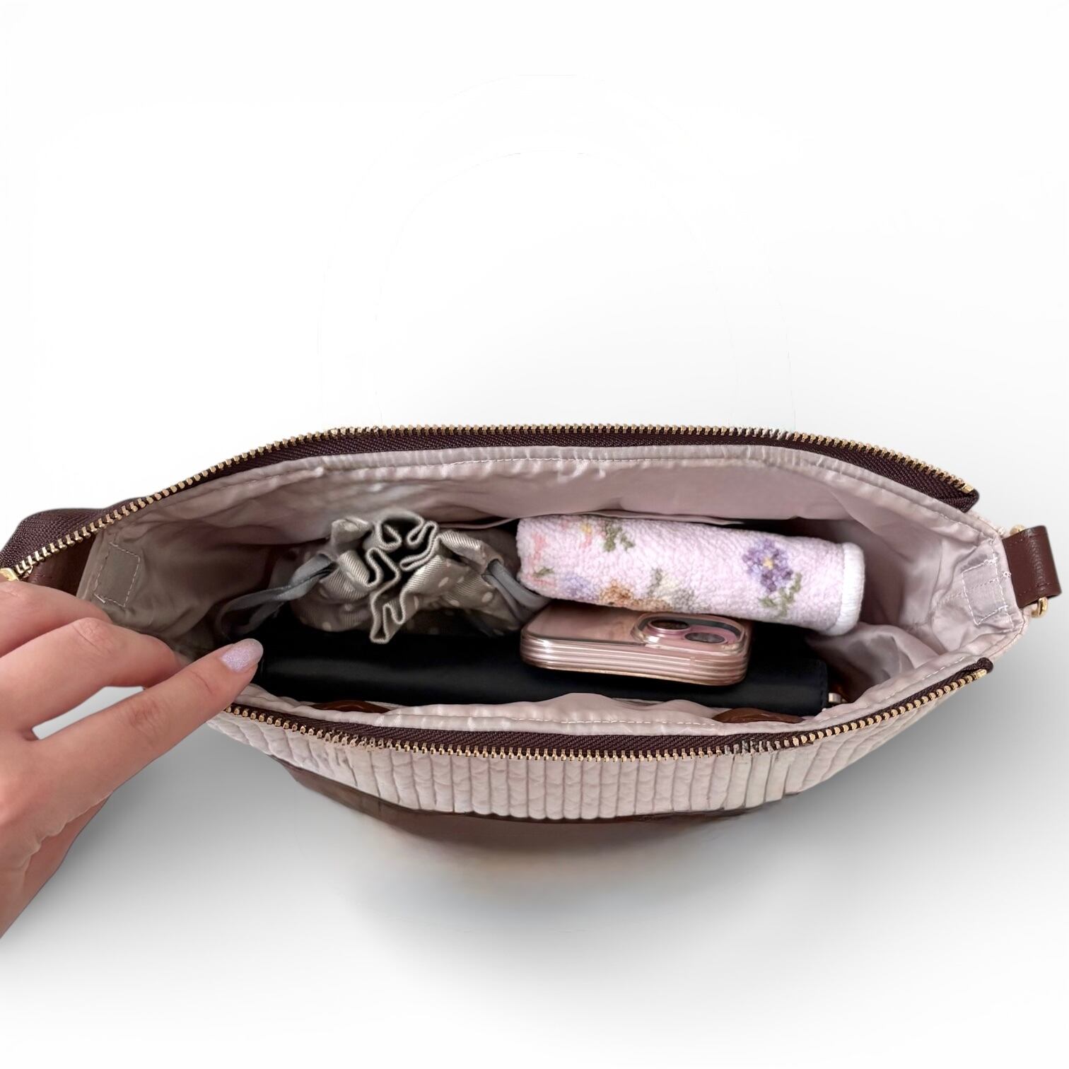 ショルダーは重いと肩が凝り、利便性に欠けるため、持ち手のないすっきりとしたデザインで軽やかな印象に仕上げました。