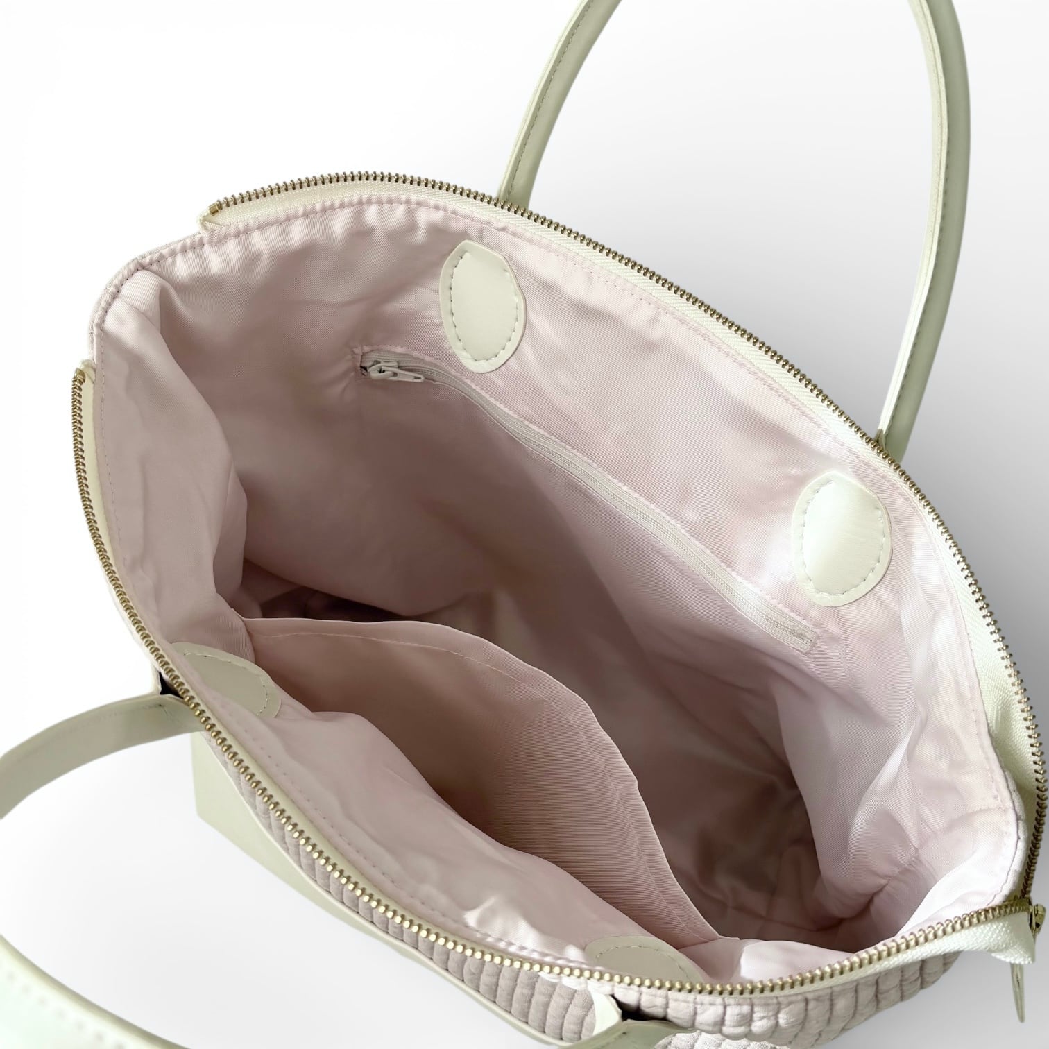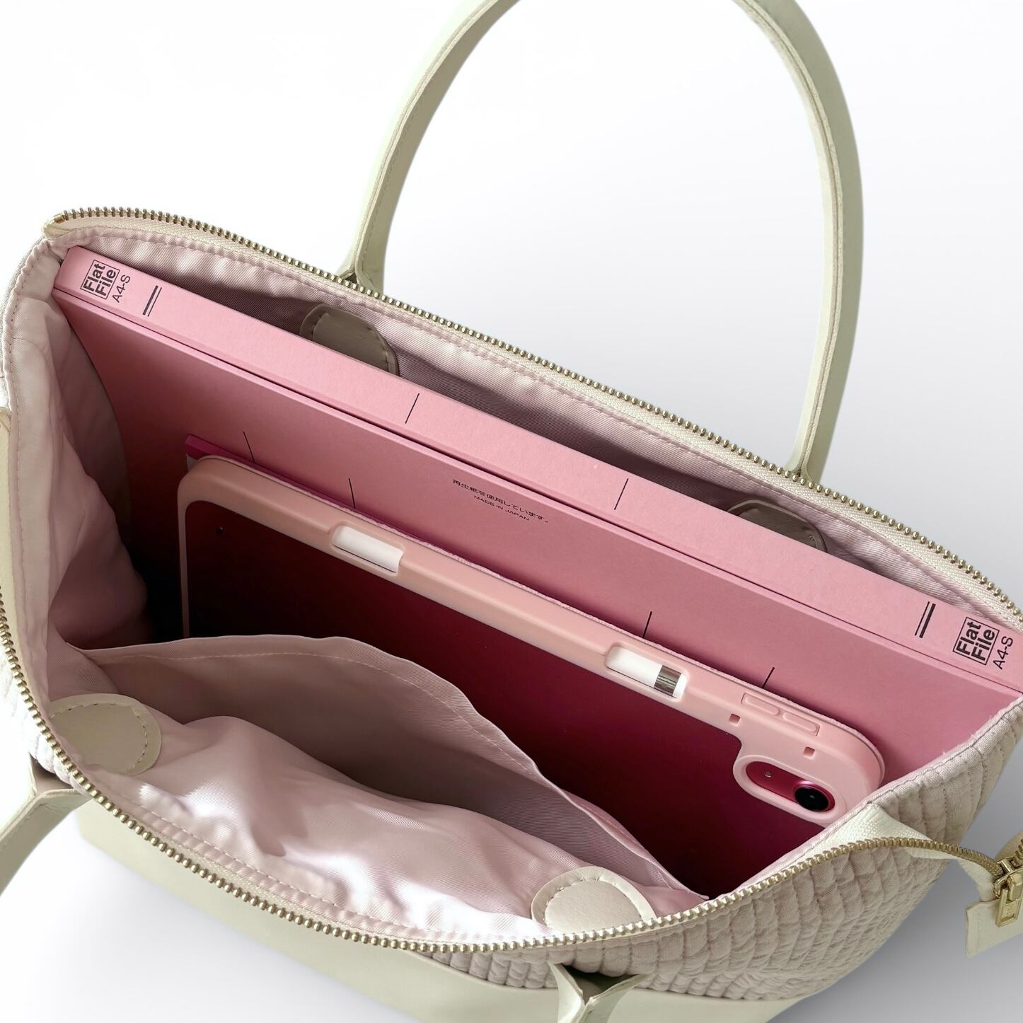 すぐに取り出したいリップやハンドクリーム、鍵やハンカチを収納できるようにチャック付きの内ポケットを備えています。